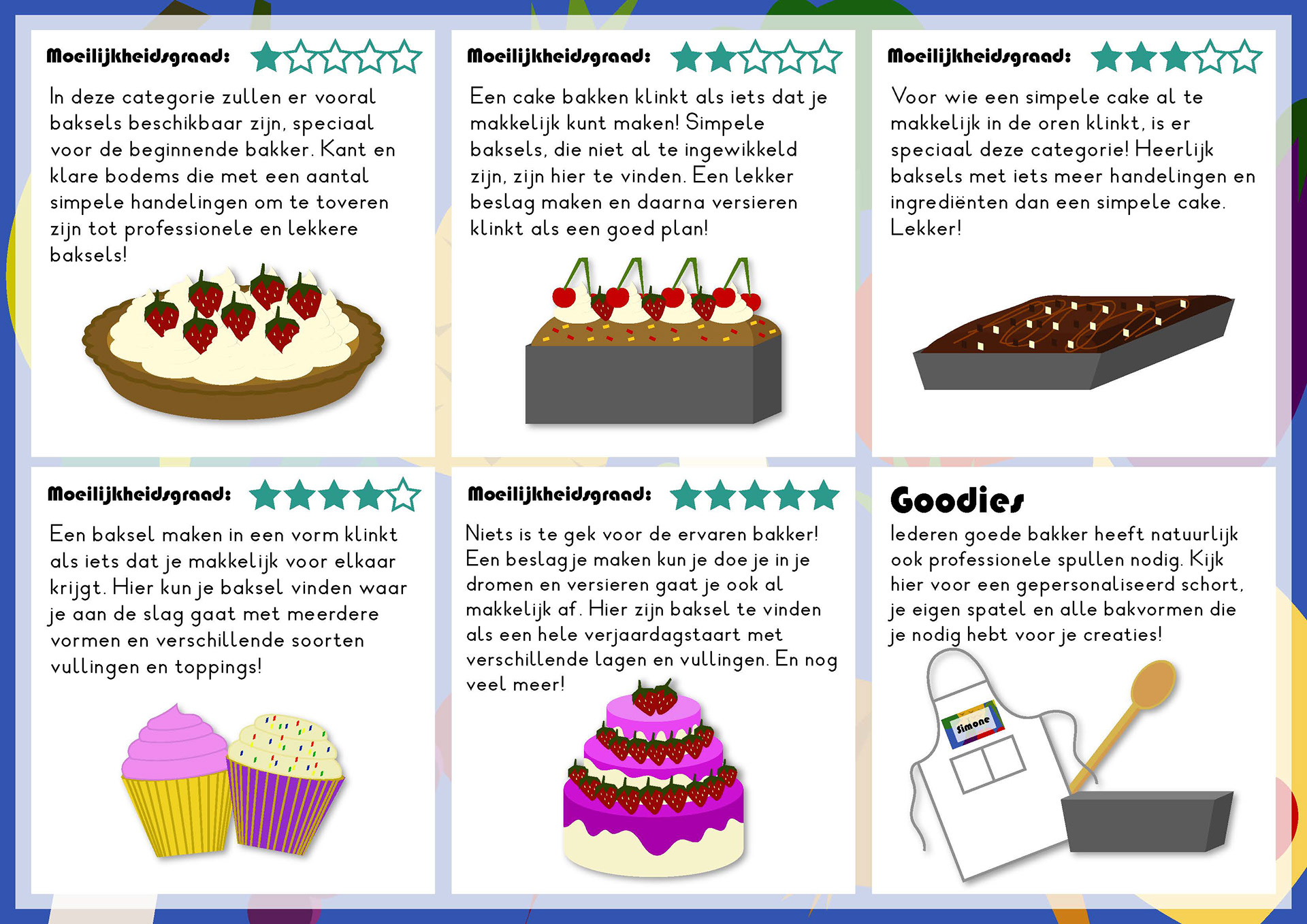 Ook zijn er gepersonaliseerde goodies te bestellen. Dit is niet alleen maar handig, omdat je een bepaalde bakvorm mist, maar ook nog eens erg motiverend voor je kind. Je kind het gevoel geven dat zij/hij echt professioneel bezig is, zal het zelfvertrouwen alleen maar omhoog krikken.